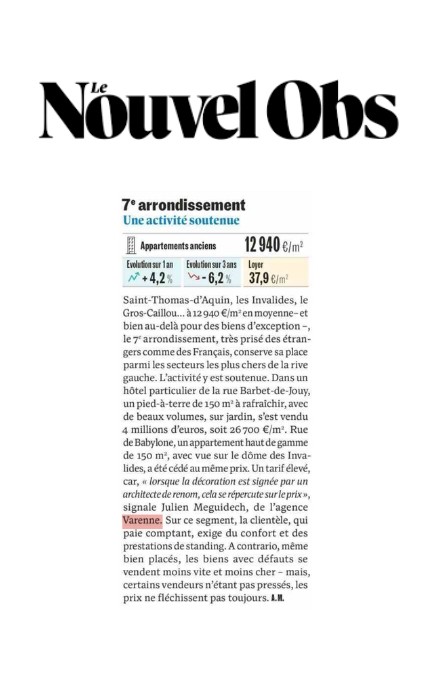 Forte de plus de 34 ans d’expérience sur le marché immobilier de prestige, Varenne est régulièrement sollicitée pour son analyse, sa lecture sensible des dynamiques parisiennes et son expertise spécifique de la Rive Gauche : un territoire d’exception que nous explorons chaque jour depuis nos agences de la place Saint-Sulpice et de la rue de Babylone.